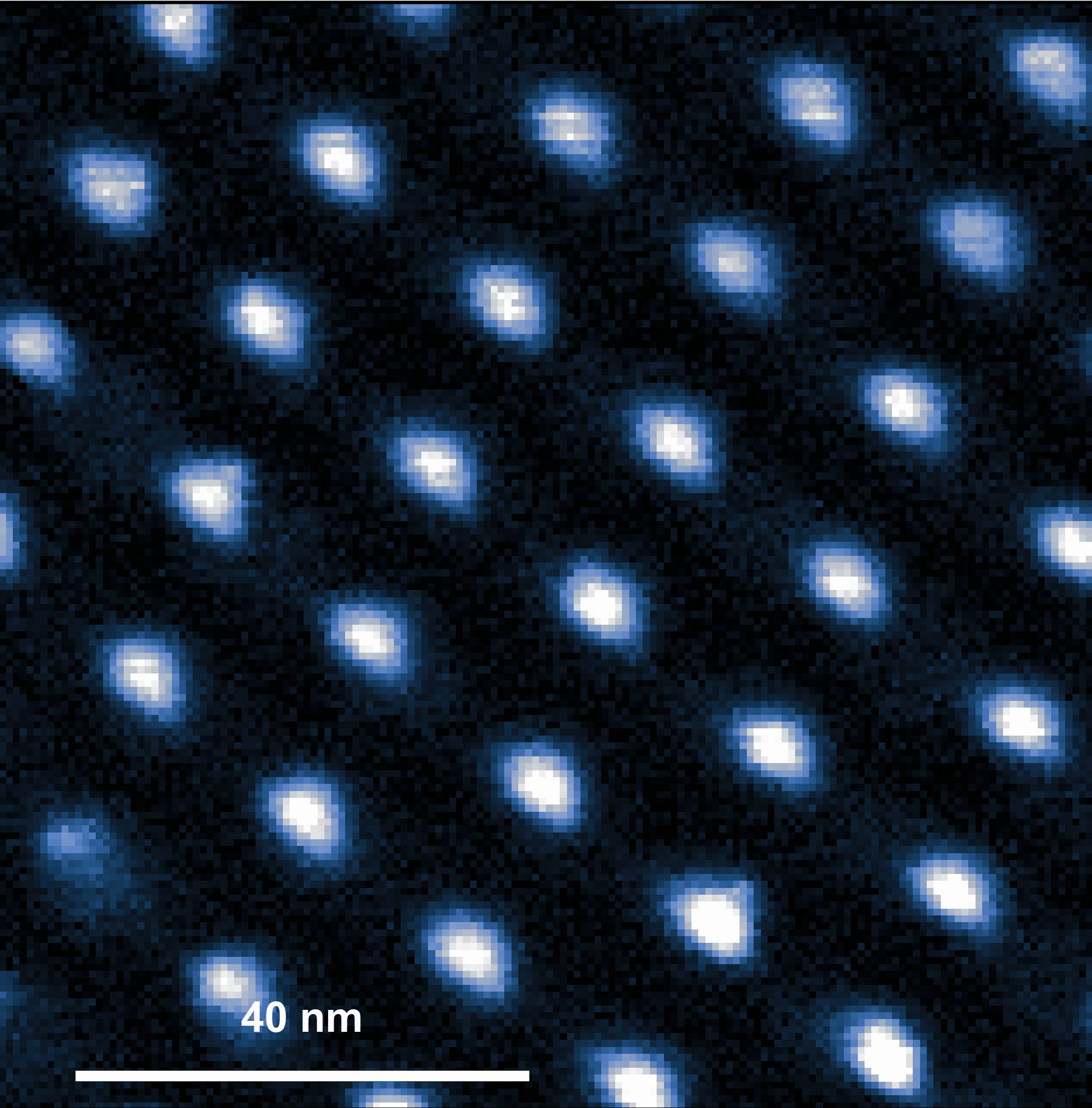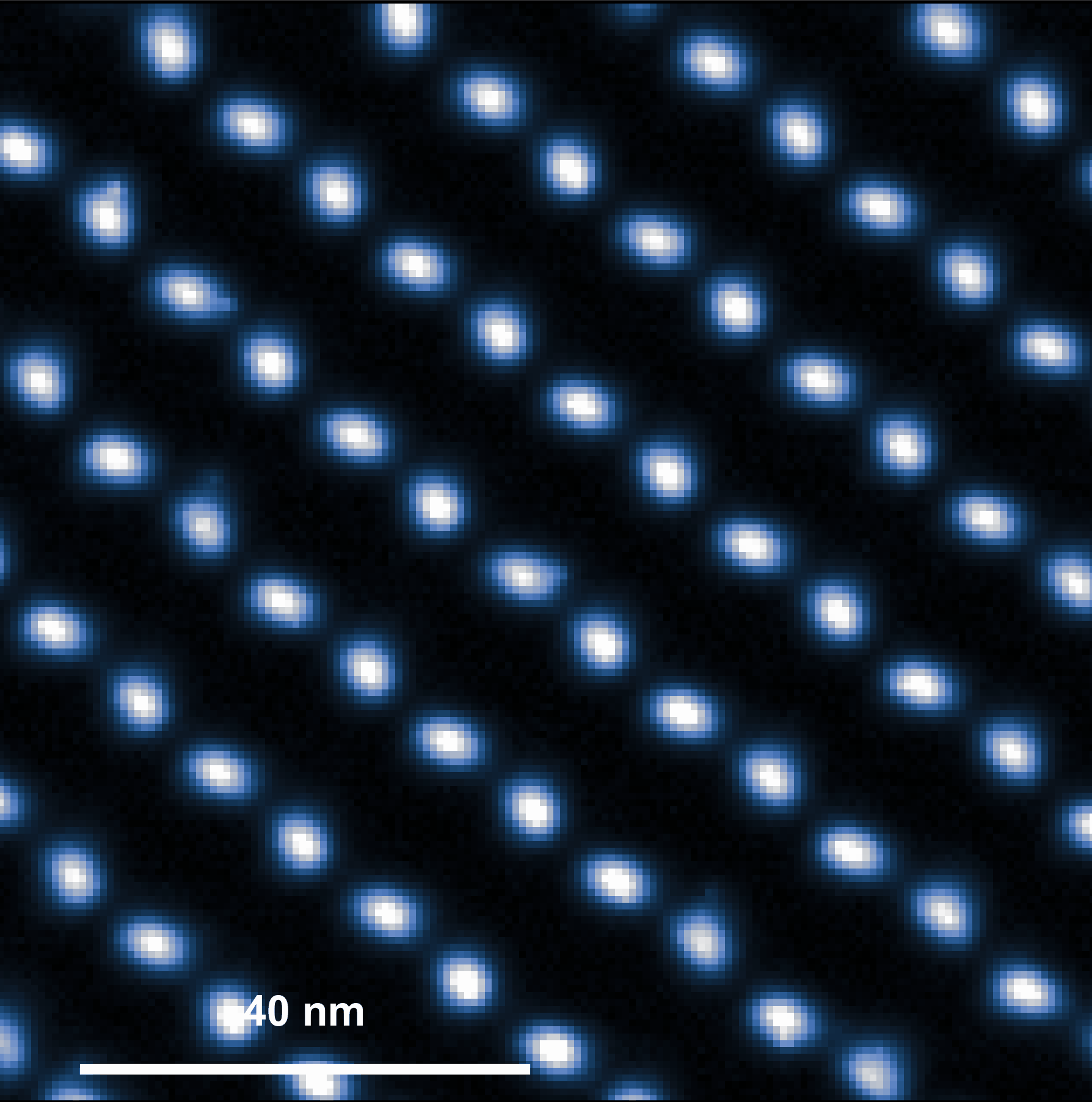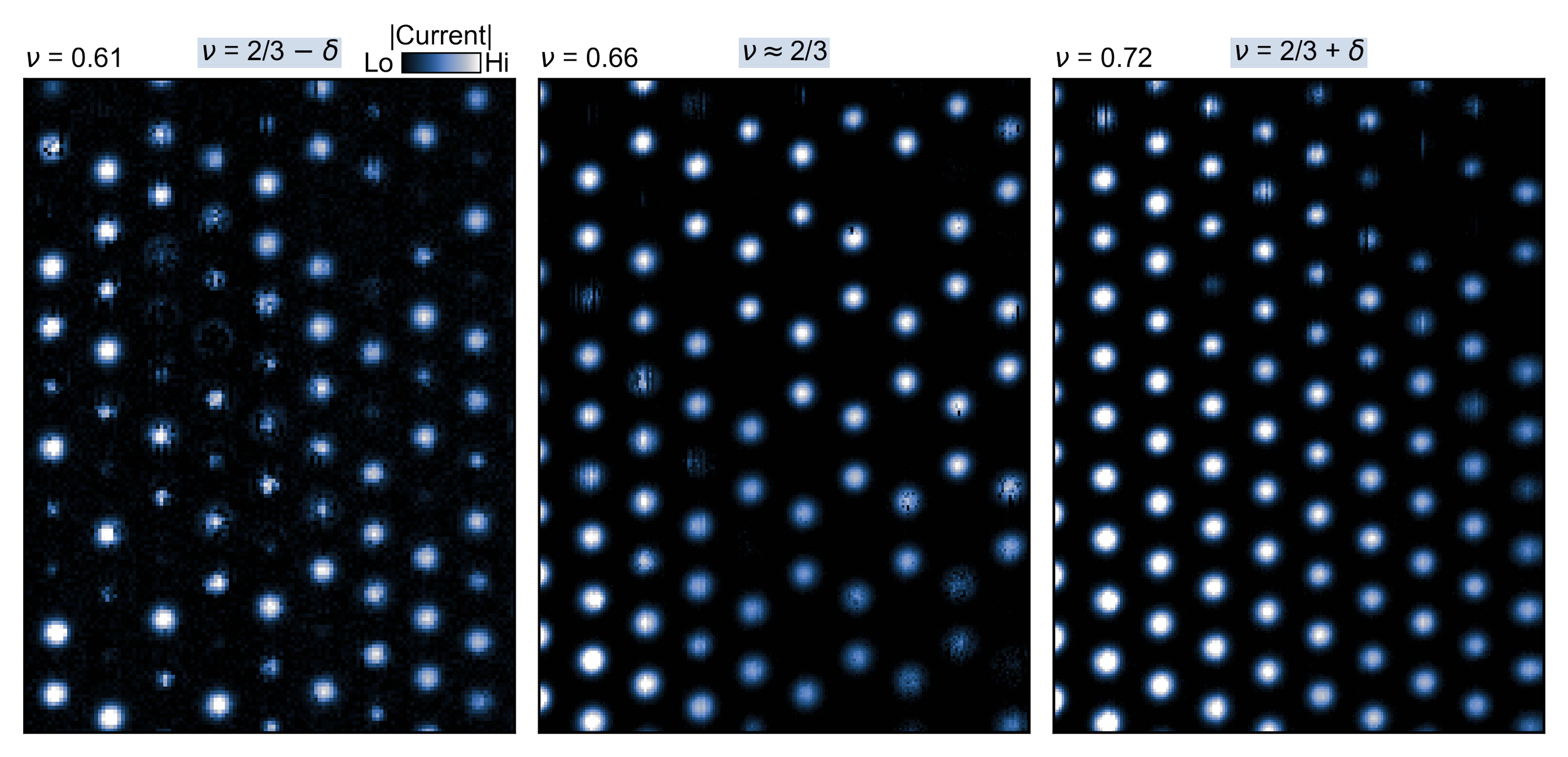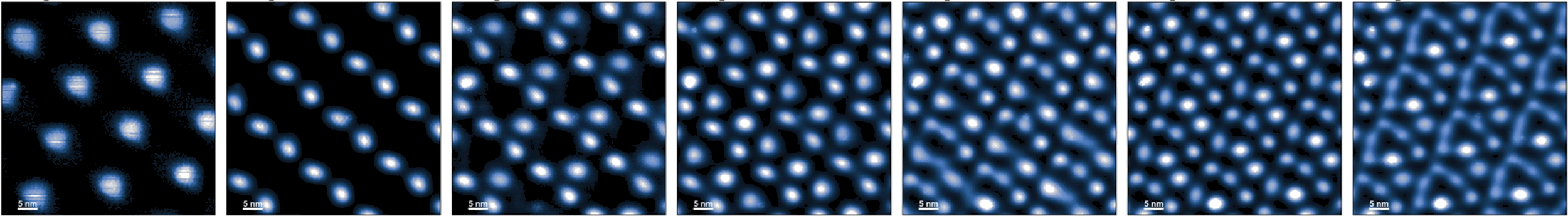 Above: Wigner molecular crystals in a twisted MoSe2 heterostructure. As the electron density is increased (from left to right), Wigner molecules form that consist of N = 1 to N = 7 electrons per unit cell. The combination of the background moire potential and the repulsive Coulomb interaction between electrons gives rise to the patterns observed.